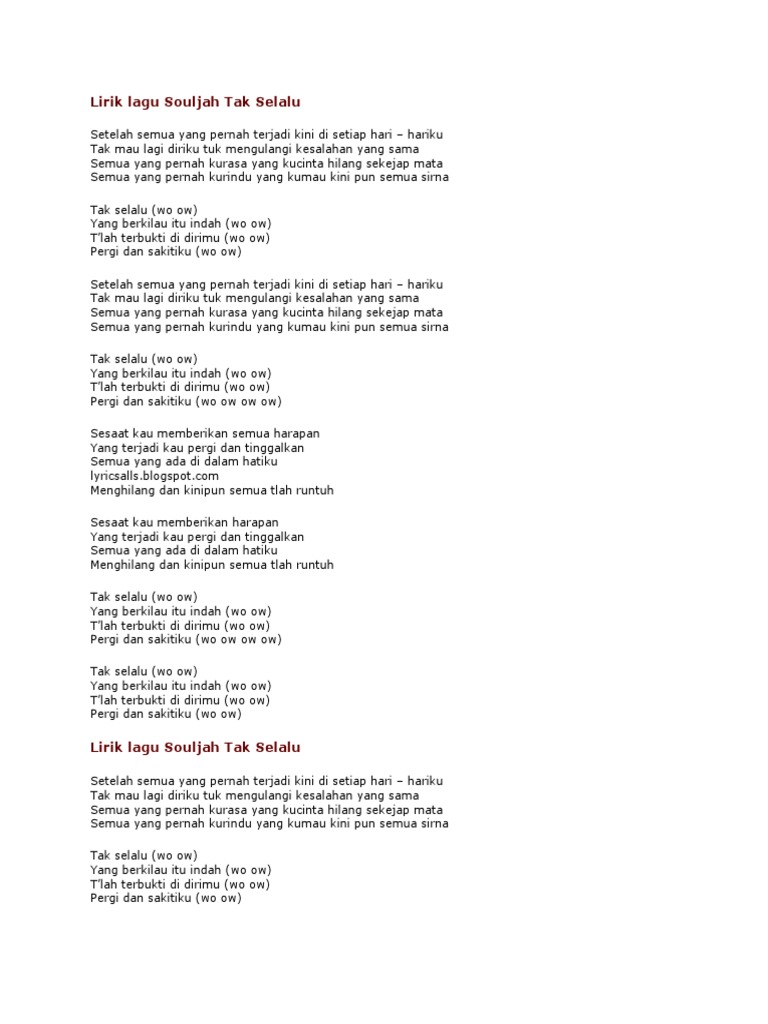 Kau memilih tuk akhiri kisah ini. Chorus Hubungan kita sudah terlanjur hilang Biarkan ku coba tuk lupakan semuanya Sudah ku bilang padamu kalau ku cinta padamu Kau tidak pernah percaya dengan semua kataku Sudah ku bilang ku tak akan pernah menyakitimu. Selamanya selamanya Selamanya Selamanya selamanya Selamanya Selamanya selamanya Selamanya.